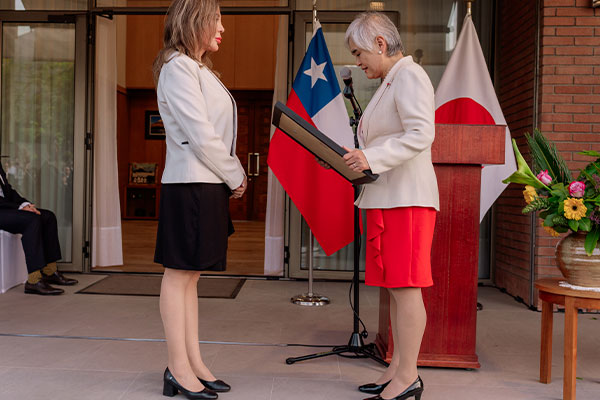 Asimismo, destacó que “es para mí un honor recibir esta distinción que me colma de alegría y gratitud. Japón ocupa en mi corazón un significativo espacio, ya que durante casi siete años me acogió y me permitió desarrollarme en diversos aspectos de mi vida. Tuve el privilegio de cursar mis estudios de posgrado en ese país, experiencia que me marcó en mi formación personal y profesional, en especial saber que la base para avanzar es el esfuerzo y el trabajo. Desde que regresé a Chile llevo conmigo el respeto hacia una cultura y un país que encarna los valores que tanto admiro: disciplina, perseverancia, armonía y por sobre todo un compromiso férreo con la excelencia”.
