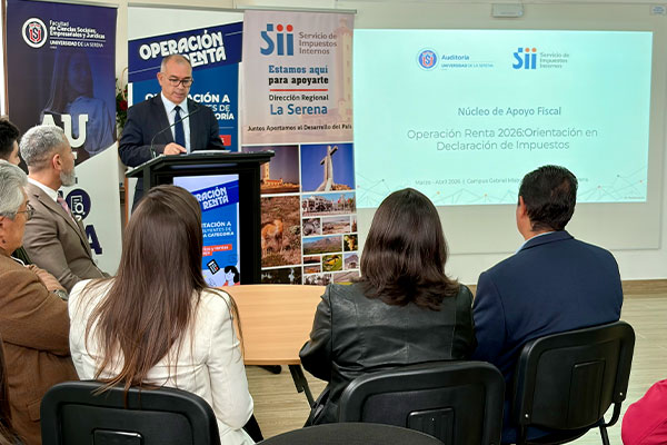 Brindar apoyo a la comunidad durante el proceso de declaración de renta, junto con fortalecer la formación práctica de las y los estudiantes de la carrera de Auditoría, es el principal objetivo del Núcleo de Apoyo Fiscal (NAF) - Operación Renta Año Tributario 2026, una iniciativa organizada por la Escuela de Auditoría de la Facultad de Ciencias Sociales, Empresariales y Jurídicas de la U. de La Serena, en conjunto con el Servicio de Impuestos Internos (SII) de la Región de Coquimbo, cuyo lanzamiento oficial se realizó en el Salón EIDOC del Campus Gabriela Mistral.